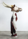 Last winter, I took a stroll through Kumortuli, the potters’ quarter of Kolkata where idols for public pujas (religious festivals) are made. There was not the buzz around the warrior goddess Durga and her entourage that fills the scene in the lead-up to the biggest puja in autumn, but there was a quieter hum of activity around Saraswati, the goddess of learning and fine arts who visits the earth in February, often carried by a swan. But in one corner I found a Durga in the making, stunningly stylized, her personhood almost symbolically distributed: the head of the lion she rides was taking shape on one side of the clay wall behind her. The trunk of Ganesha, her half-elephantine son, emerged from the other. At her feet, Mahishasura, the shape-shifting half-buffalo demon whom she slays, was presented as a mask on the head of a calmly seated man with a curiously gentle face: the human and the monstrous placed in contiguous but distinguishable relation. How similar this aesthetic is to that of Animus Mundi and Kher’s other hybrid bodies; how similarly tuned their intuition and acceptance of the disparate aspects of nature—both human and nonhuman—and how they can transform into one another! And how deep the affinities, too, between ideas of the performative self in the West and the East: the bull’s eye could have belonged to Durga herself, and the half mask reminded me of the Greek word prosōpon, used with its full dual charge in Euripides’s Bacchae—meaning both “face” and “mask.”