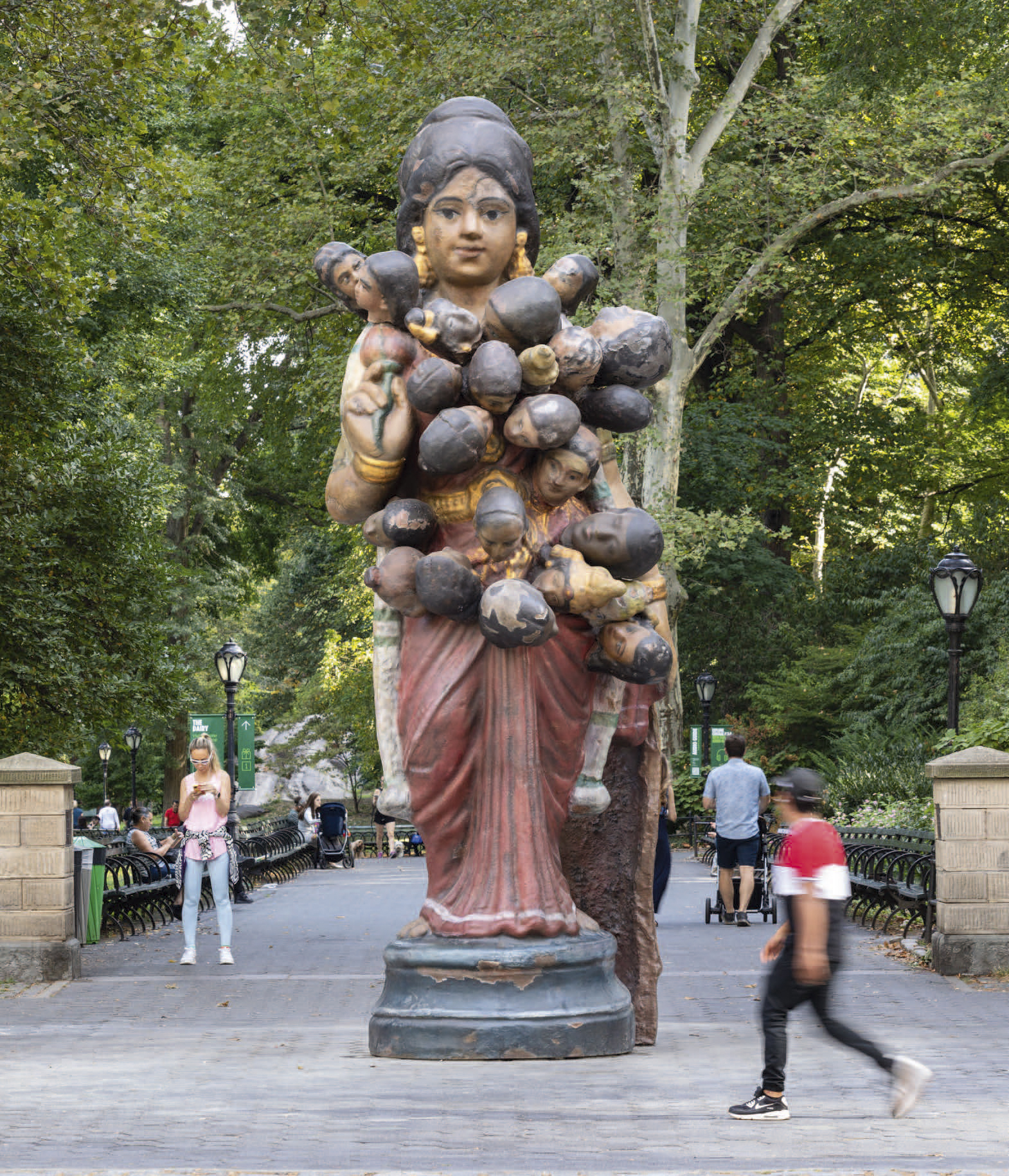 In 2022, Kher installed the eighteen-foot Ancestor in New York’s Central Park, where it towered above one of the gates, a bronze every-mother clad in a sari, with twenty-four physiognomically diverse heads burgeoning from her torso. Another bold scaling up of the aesthetic of The Intermediaries, it is made of broken and found figurines that show the scars and cracks acquired in their journeys. The work organically codes the multiplicity, contradiction, and diachronic continuity of female fecundity and labor.