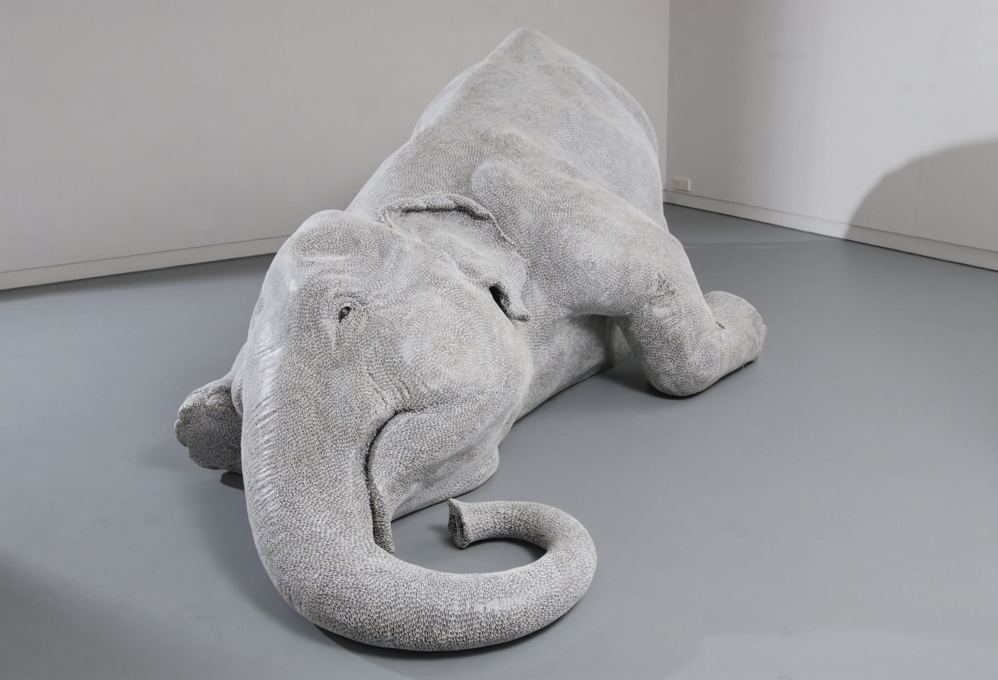 The monumental and the particulate come together spectacularly and movingly in Kher’s famous early work The Skin Speaks a Language Not Its Own (2006), a life-size fiberglass elephant that has fallen to its knees under its own weight. Its eyes glisten and plead; it appears to be dying. But its skin is made of a dense, endless web of white bindis in serpentine whorls that balance its gravity with a poignant grace. Drawing the eye closer, they incite engagement at a minute and animating level, an alternative to the distant Western view that exhausts the elephant—as well as its surrounding culture—by framing it as an icon of India.