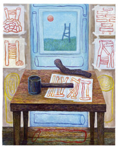 BM: I paint complex structures built from simple components. They stand horizontally to show the thin line of gravity holding them together; in real life, a structure like that would collapse within seconds. I like to reveal the surprising tenacity of a fragile structure. It echoes the way various aspects of life are intertwined without causing the universe to collapse.