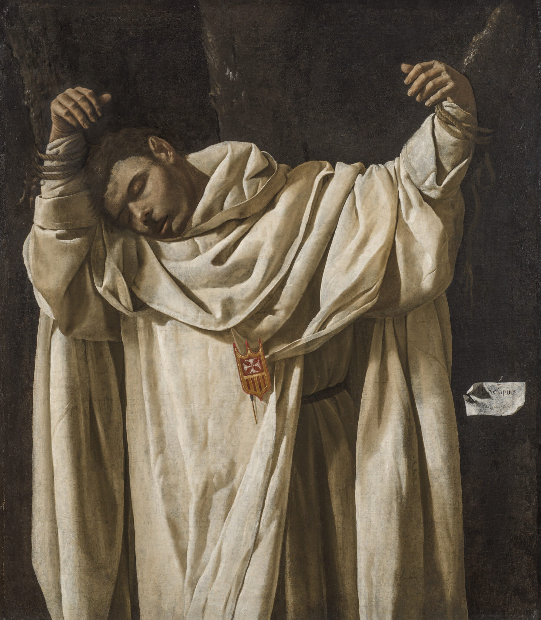 To the right of the martyr’s pleated cloak, a small rectangular card—a cartellino—is pinned to a tree: another hanging element to remind us again of Zurbarán’s