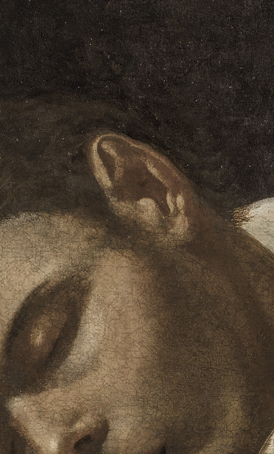 Zurbarán stages our encounter so that we’ll see what he saw, but he also invites us to listen. In the exaggerated helix of Serapion’s ear, a pareidolic form emerges—odd, yet as deliberately painted as the rest of the face: It’s hard not to see the Virgin Mary’s unmistakable custodial shape. Zurbarán’s subtle and, I believe, intentional inclusion suggests that the Virgin—patroness of the Mercedarian order—whispers to the dying monk in a final gesture of grace.