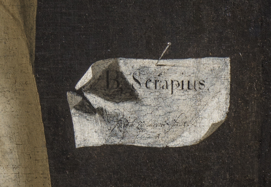 On it, the name of the martyr: B. Serapius. English-speaking viewers may read the letter B as the verb be in the imperative. I wonder if Zurbarán intended this as a nod to Serapion’s native tongue. A deliberate linguistic puzzle spanning centuries is probably too much to wish for, yet the implied command—“You, be Serapius”—strikes the heart.