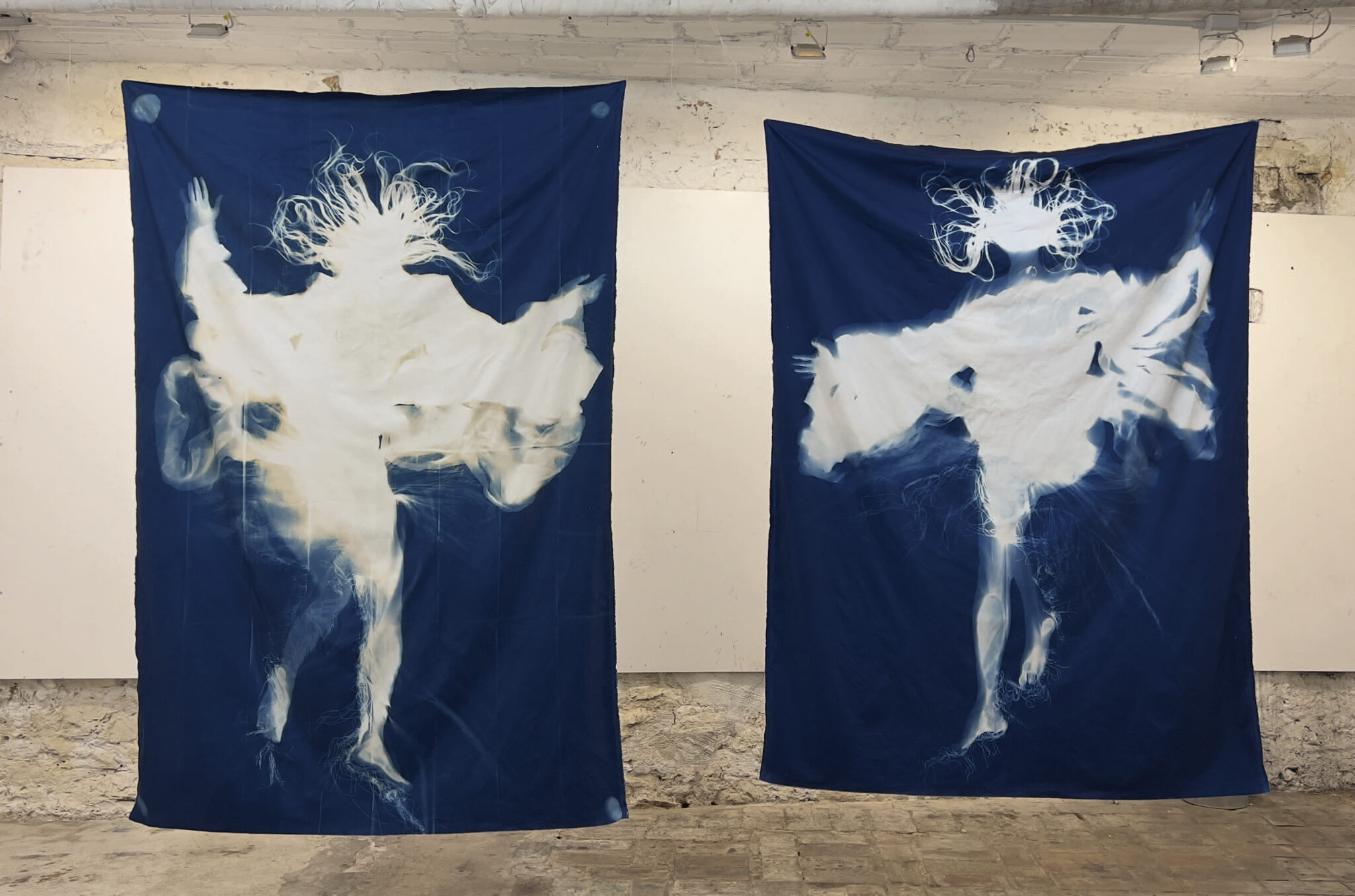 Nymphalidae (Sibyl) I and II, 2024. Cyanotype on cotton. 96 x 60 inches each. International Center for the Arts, Monte Castello di Vibio, Italy.