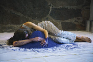 The Weight of Water, 2022. Live performance with blue sand the weight of the water content of artist’s body. DeCordova Sculpture Park and Museum, Massachusetts. Photo: Luke Myers.