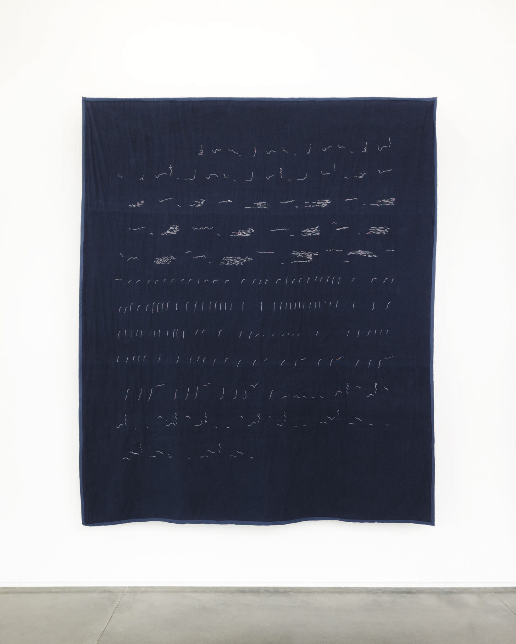 Song of a Humpback Whale, 2023. Cotton quilt hand-embroidered with humpback whale vocalizations, transcribed by Roger Payne and David McVay from spectrogram recordings. 110 x 91 inches. Photo: David Clough.