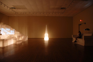 PLATE 9. Dayton Castleman. Coin, 2013. Corrugated plastic, plastic mounted slides, slide projector, incandescent lights, dimmer system, wood, hardware. Texts and images from William H. Harvey’s The Pyramid Booklet, The Book, and Common Sense.