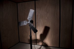 This early installation presages Castleman’s ongoing concerns. His sculptures are embodied investigations of point of view, the power of seeing and believing, and the metaphor of illusion. These three concerns converge powerfully in his 2011 piece Negative Matter [see Plate 7]. The piece is quite simple. Sitting within the gallery is a ten by twenty-foot plywood room, eight feet high, with a single entry point. Standing outside, the viewer hears a deep and resonant hum which grows in intensity as she approaches the threshold, where she also begins to feel a faint breeze emanating from the enclosure. Upon entering the dim interior she is faced with a strong wind and a large, industrial fan, starkly lit by a single light source. The fan’s three large blades are ominous, but unmoving. Gale-force winds and an industrial roar reverberate in this sensory echo chamber, but their source is undetectable. The sparse environment offers only one suspect—the motionless fan—and the space yields no further clues.