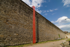Castleman’s first large site-specific installation, The End of the Tunnel (2005), was a public art project awarded by the Eastern State Penitentiary Historic Site in Philadelphia, a nineteenth-century panopticon that has been preserved as a historic monument and serves as a cultural and art venue. A panopticon is a type of prison based on a design by the late-eighteenth-century philosopher Jeremy Bentham, in which inmates are observable by guards at all times, but the inmates cannot see their warders. Bentham’s idea was analyzed as a cultural metaphor by the philosopher and cultural theorist Michel Foucault in his influential 1975 book Discipline and Punish. Foucault’s observations, in particular on the abusive power of the gaze, heavily influenced a generation of cultural critics and art theorists. Castleman deftly harnesses this loaded context and with a minimal gesture transforms our perspective of the site.