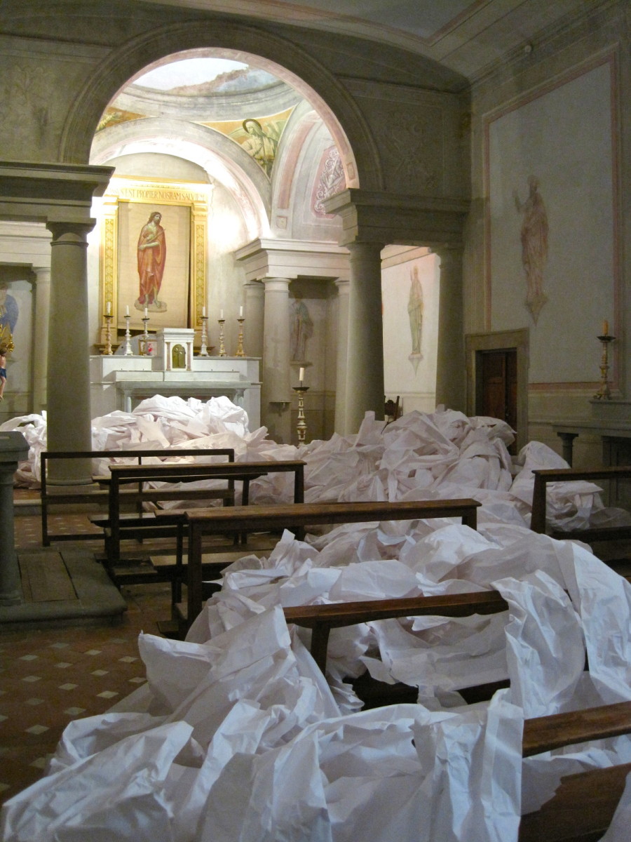 She also wanted to reflect the Carthusian idea of the horizontal leading to the vertical, and that, in turn, leading to a widened horizontal. She wanted the viewer to see the space in a fresh way. “My aim was to move the eye up and down in flux, mirroring a contemplative life of moving actively between natural and spiritual.” The lower part of this baroque space—complete with columns, paintings, and elaborate candelabras—is covered with large masses of white paper spreading over the pews and encircling the altar. Here this most common of materials becomes the horizontal that holds out its hands, as it were, to the vertical space and its implicit transcendence.