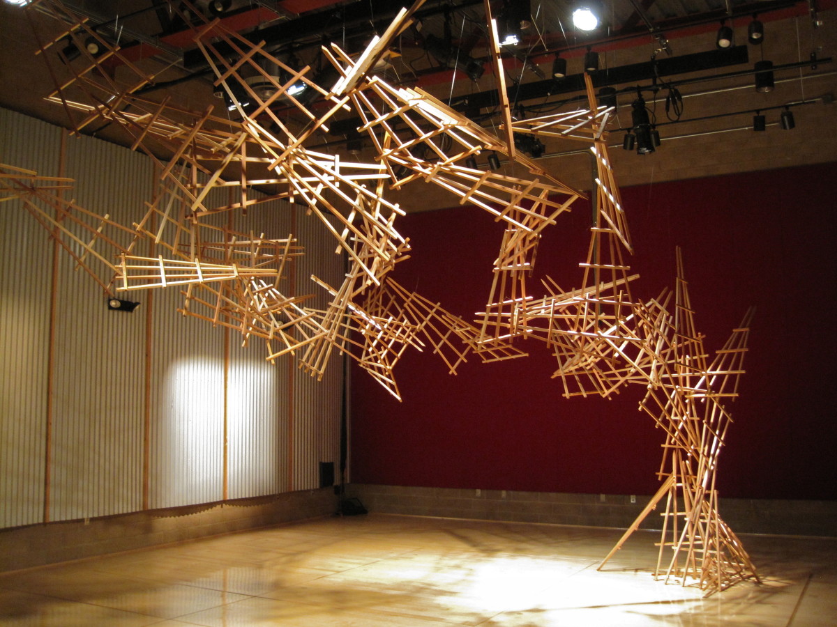 Lah created a similarly evocative installation for a large theater space in Pasadena, Ascension [see Plate 18]. The idea for this piece came to her in the garden section of Home Depot, where she came upon fan trellises with their uniquely suggestive shapes. When the opportunity came to work in the large stage of Boston Court Theatre in Pasadena, she immediately thought of those trellises. Initially she was going to have them hang in mid-air, but during the installation she realized that attaching them to the floor would add a sense of thrust and movement. The result is an exploding array of trellises, which do not simply articulate the space, but expand and lift it up before our very eyes, moving out from our reality into an “intangible, untouched space.” As the title implies, the piece embodies Lah’s commitment not only to reframing space and remaking her materials but also to shaping transcendent gestures in the most ordinary spaces—here referencing Christ’s own translation from this reality to a place beyond.