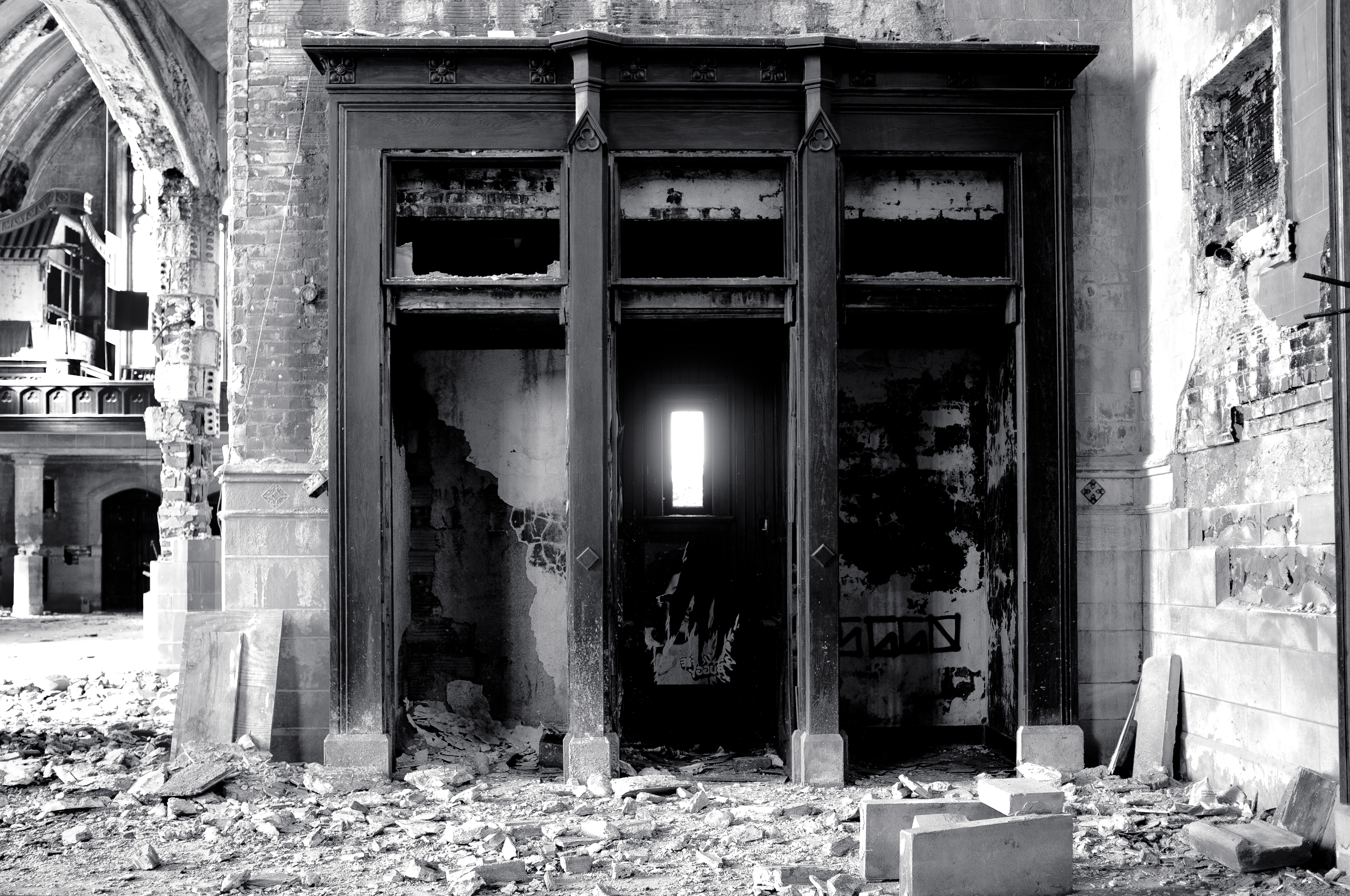 In his photographs of urban Toronto, Jonathan Castellino explores abandoned office spaces, with dated computer monitors and keyboards still dutifully in place under layers of dust; empty factories, where water infiltration and the resulting mineral bloom create a forlorn beauty; and crumbling church interiors layered with brick dust and graffiti, all bathed in eerie light. But Castellino can’t be pigeonholed as a documentarian of urban ruin. In the loving way they frame these lost and humbled spaces, the photos convey a sense of stillness and attention that often feels holy. Certain works present urban forms as a sort of found sculpture, majestic shapes whose beauty usually escapes us. Even in spaces where the decay is most advanced, the mood is meditative rather than shocked. What he’s often photographing is the passage of time, the inescapable fact that certain human aspirations do crumble and pass away. Spending time with his photos is likely to change the way you see your own city. Samuel Thomas Martin’s vivid personal essay from issue 86 describes how for him, as a person whose Pentecostal background has made him wary of church imagery, the eerie sense of absence in Castellino’s photos has itself become a sort of manifestation of divine presence. Martin writes, “Each of his photographs, in setting apart a scene, becomes a sacrament: a lifting up of things seen to recognize their significance—to reveal that significance, that holy worth.”