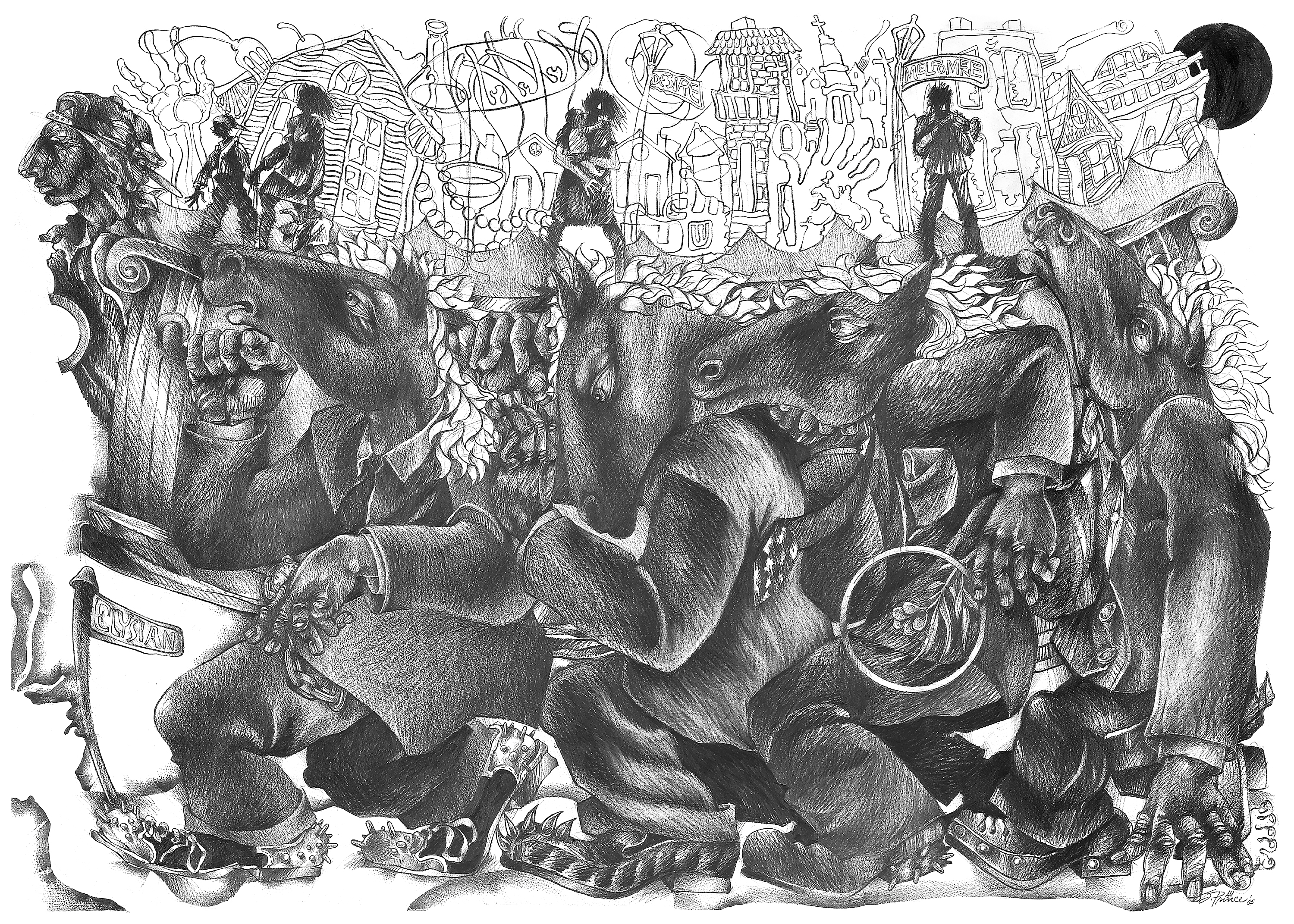 “There’s a lot we haven’t dealt with in our soul, so I like to deal with it in my artwork,” says printmaker, sculptor, and graphite artist Steve Prince. That concept of the collective soul (and its collective burden) is essential to Prince’s work and to his sense of mission as an artist. His series the Katrina Suite, featured in Image issue 78, is the perfect example: New Orleans native Prince (who had departed his hometown just a day before the storm hit) channeled New Orleans funerary rituals, the diasporic traditions, and his own familiarity with the weight of the city’s history to articulate a culture’s mourning and resurrection. The Katrina Suite takes three parts, beginning with Katrina’s Dirge, a song of mourning that “complicates the impulse to shelter behind the so-called ‘universal’…the piece inaugurates the Suite’s persistent request that viewers come face-to-face with Katrina’s specificity,” says Beth McCoy in her Image essay on Prince’s work. Second in the Suite is Katrina’s Veil: Stand at the Gretna Bridge, which revisits the infamous incident at that bridge during the storm’s aftermath, visually linking it to March 7, 1965’s Bloody Sunday, when civil rights demonstrators were attacked at a bridge in Alabama. Finally, in Second Line, Prince created scenes of festival, acknowledging the city’s rebirth. Some of the pieces in the Katrina Suite, deeply engaged with a public loss, were actually created in public. Prince visited four U.S. cities, locations to which the post-Katrina diaspora flowed, and set up his work in outdoor spaces, where he fielded questions from curious passersby. This was only fitting, as Prince’s work insists on inviting the viewer in: his images sound the cry of the mountaintop prophet, come down to speak truth to power and mercy to suffering. Each of his pieces holds a story, a truth that must be told. Narratively detailed and brocaded with symbolism, but created with a unique clarity of purpose, his images shine forth like so many stained glass windows.