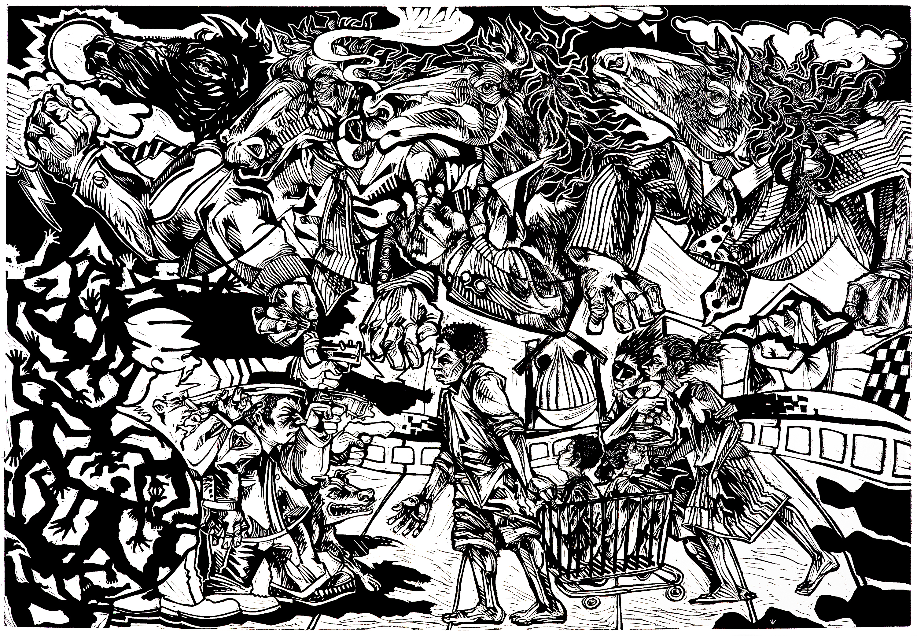 I am continuing work on my series Urban Epistles which was birthed from my study of the thirteen letters attributed to Paul in the New Testament. In this series of large scale linoleum cuts, I recontextualize the letters and utilize their truths to grapple with modern moral dilemmas, issues of race and representation, hegemony, gender concerns, etc., through a Christian lens. I utilize the language embedded in Christian iconography and fashion a contemporaneous language that speaks to contemporary culture. Each image in the series is layered with symbolism to offer a space for us to have an open dialogue about the issues in society but most importantly, the artwork is a call to action. We must get up from our pregnant tables overflowing with bounty and be active in the lives of people regardless of ethnicity. I postulate in the series that we are all living epistles. As Christ said, we have been called to be fishers of men. As Paul proclaimed we must put on the armor of God, because the battle is not against flesh and blood, but against principalities. With my art, it is my hope that it will admonish, uplift, challenge, enlighten, empower, and encourage us to be more like Christ.